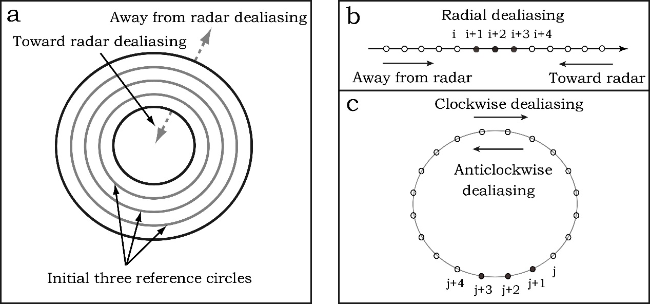 江西师范大学鄱阳湖湿地与流域研究教育部重点实验室/江西师范大学江西省自然灾害监测预警评估重点实验室,基于雷达径向速度随方位的演变特征和多项式拟合方法,发展了一种新的2D雷达径向速度图模糊算法。该方法先运用5阶多项式拟合法来寻找初始参考速度圈,再执行径向退模糊、方位退模糊和全局退模糊,最终更正整个2D平面内的模糊速度。
