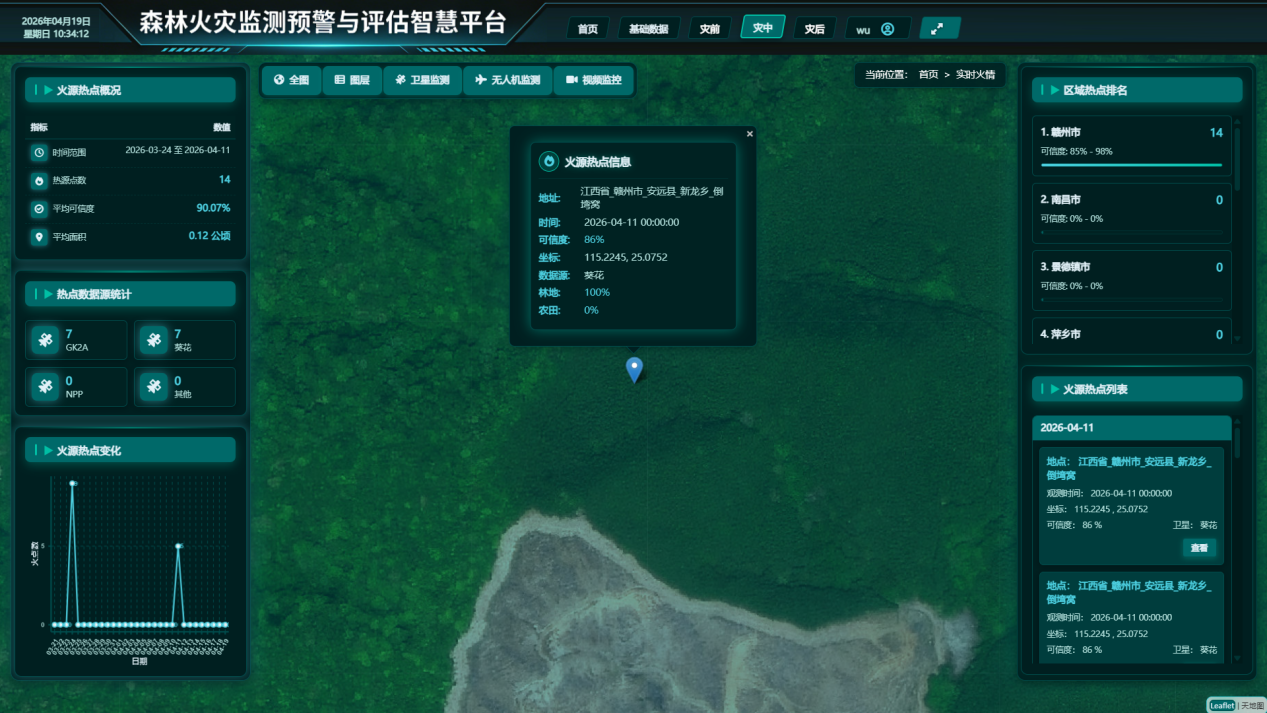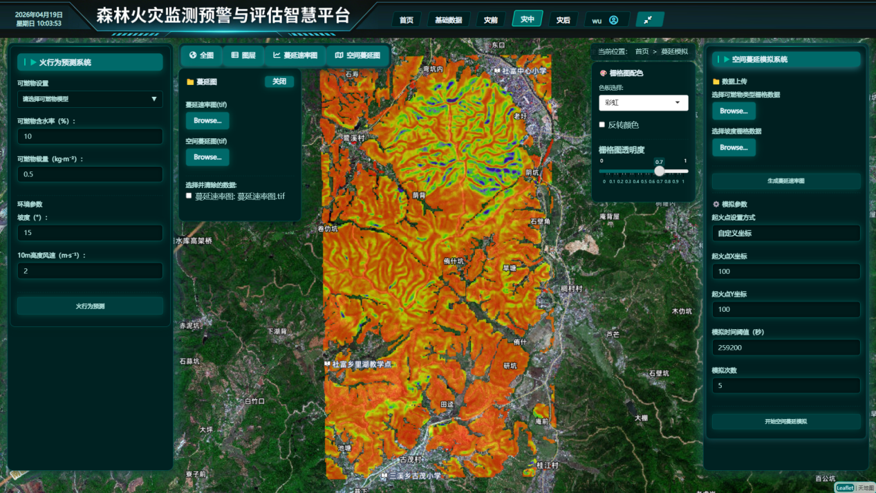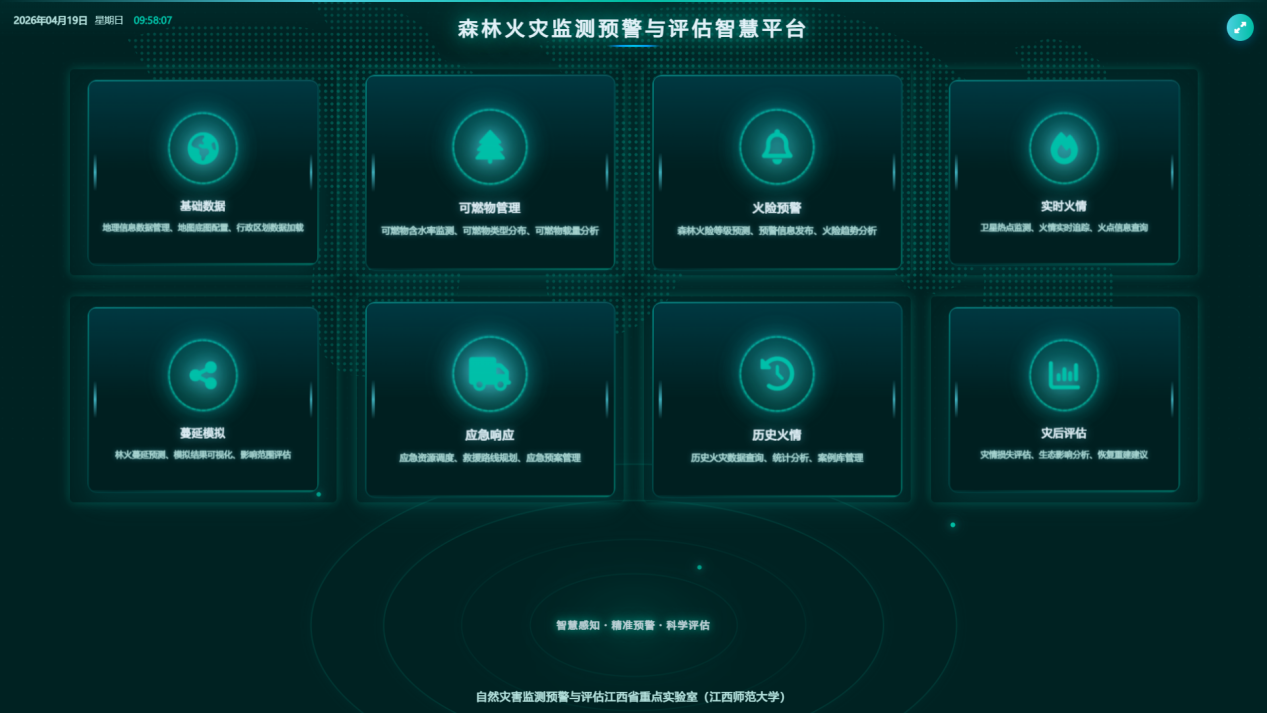 近日,“自然灾害监测预警与评估江西省重点实验室”森林火灾团队完成"森林火灾监测预警与评估智慧平台"v1.0版本的研发。平台包括“基础数据”、“可燃物管理”、“火险预警”、“实时火情”、“蔓延模拟”、“应急响应”、“历史火情”、“灾后评估”等功能模块。该平台注重技术与实际需求的结合,采用模块化设计,便于与现有防火管理系统对接。实验室团队在研发过程中充分考虑基层使用场景,优化操作流程,提升系统的易用性。